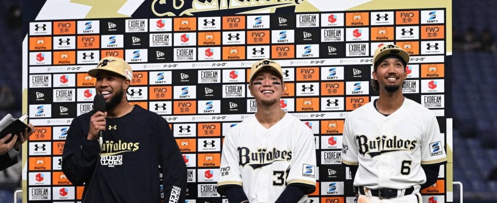 【写真】オリックス対ロッテ ヒーローインタビューで爆笑を誘う左からオリックスのエスピノーザ、杉沢、宗(撮影・和賀正仁)