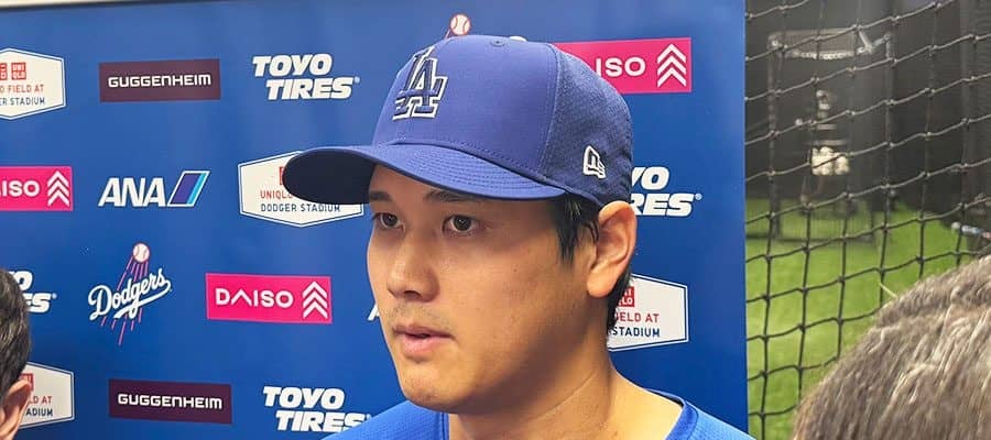 試合後の取材に応じたドジャース・大谷翔平【写真:小谷真弥】
