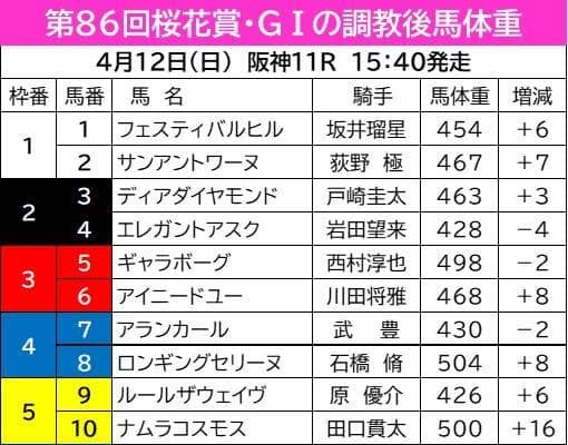 桜花賞出走馬の調教後馬体重(増減は前走からの比較)
