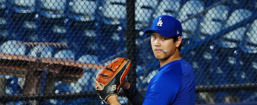 【写真】ブルージェイズ対ドジャース 試合前、ブルペンでペンをくわえて投手動作を確認するドジャース大谷(2026年4月7日撮影)