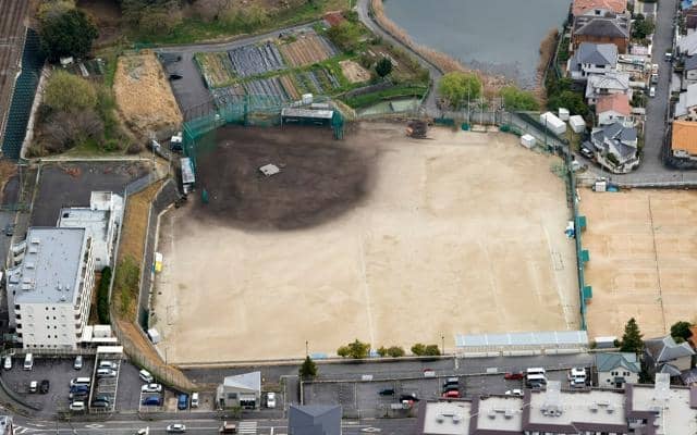 落雷事故があった帝塚山中学・高校グラウンド=2025年4月11日、奈良市学園中1丁目、朝日放送テレビヘリから、小杉豊和撮影