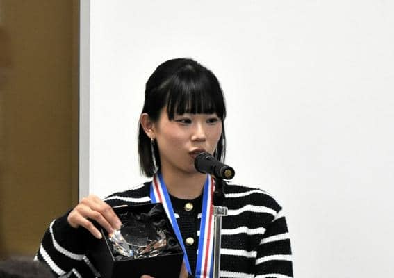 優勝したメダルやクリスタルを見せながら、後援会設立総会であいさつする林かりん選手=2026年3月30日午後2時4分、鳥取県北栄町由良宿、奥平真也撮影