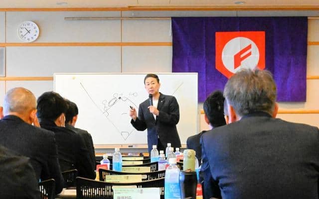 今春の選抜高校野球大会について講演する元米子東監督の杉本真吾さん=2026年4月10日午前10時45分、鳥取県倉吉市、佐藤常敬撮影