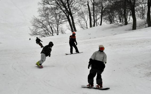 雪に覆われたゲレンデで滑走を楽しむスノーボーダー=2026年4月10日、山形県西川町の月山スキー場、斎藤徹撮影