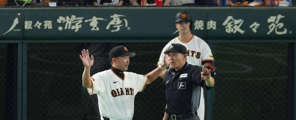 【写真】巨人対ヤクルト 7回裏巨人2死一塁、審判に抗議する巨人阿部監督(撮影・増田悦実)
