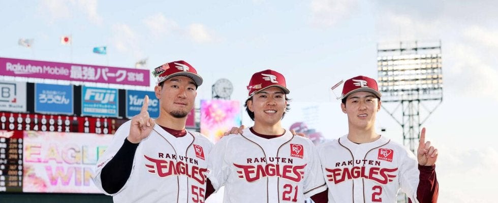 【写真】楽天対オリックス 勝利し笑顔を見せる、左から楽天YG安田、早川、太田(撮影・鈴木正人)