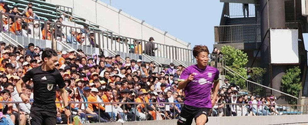 清水サポーターの前をドリブルで突破する藤枝の選手(カメラ・里見 祐司)