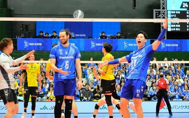 試合中に喜ぶ大阪ブルテオンの西田有志(右)ら=2026年4月12日午後3時48分、大阪府枚方市、仲程雄平撮影