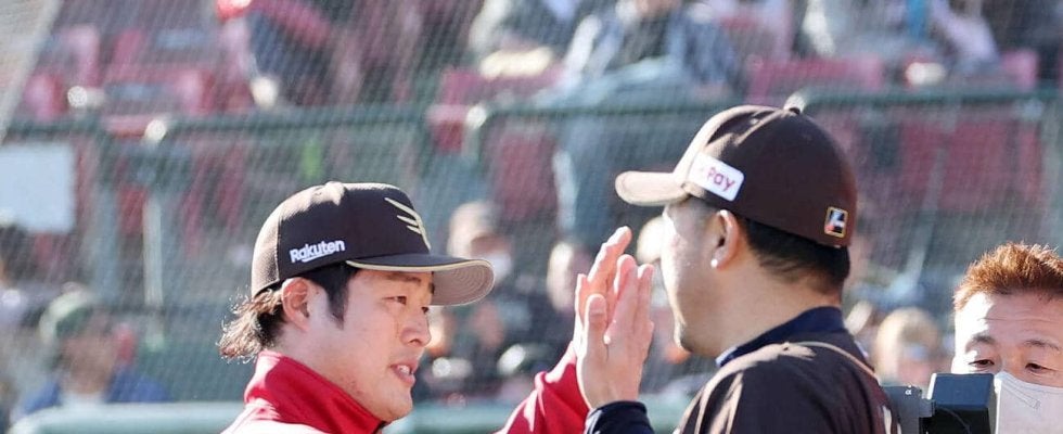 【写真】楽天対オリックス 勝利しタッチを交わす楽天滝中と三木監督(撮影・鈴木正人)