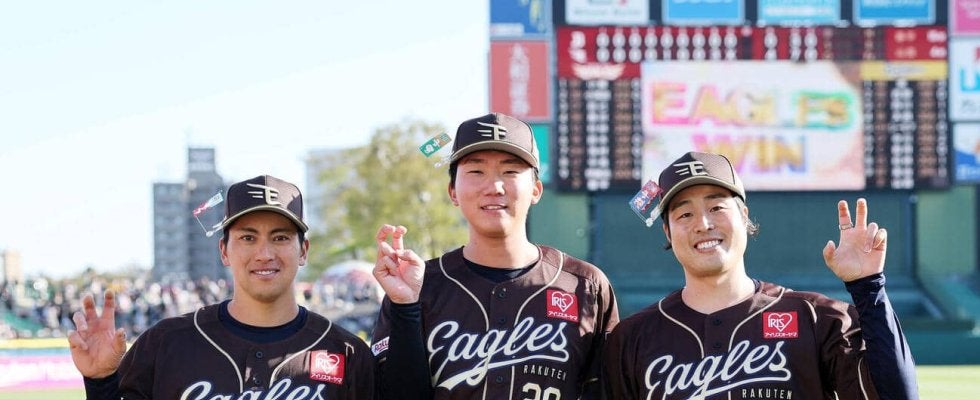 【写真】楽天対オリックス 勝利し「最強の鷲」ポーズを決める、左から楽天小郷、田中千、滝中(撮影・鈴木正人)