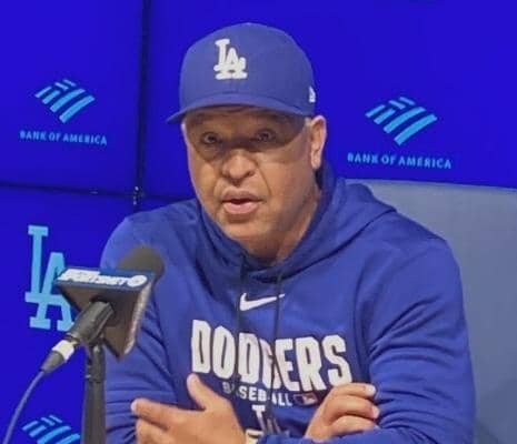 「ドジャース-レンジャーズ」(12日、ロサンゼルス) ドジャースのロバーツ監督が試合前の会見で前日の試合で休養を与えた守…