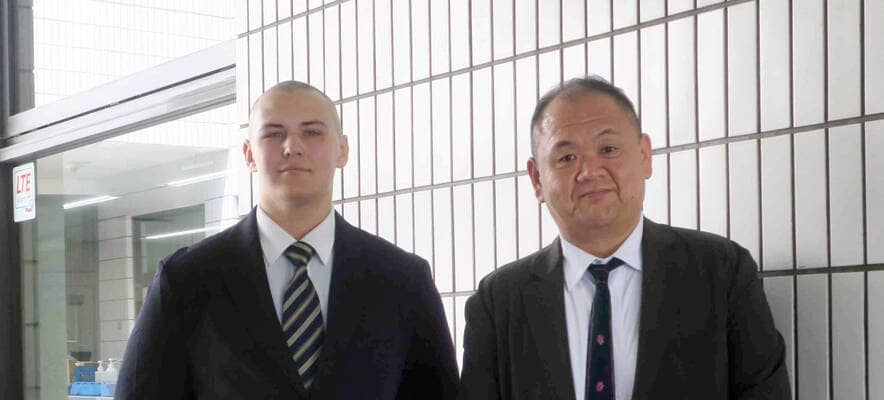 ニコラス・タラセンコと湊親方が国技館で笑顔を見せる