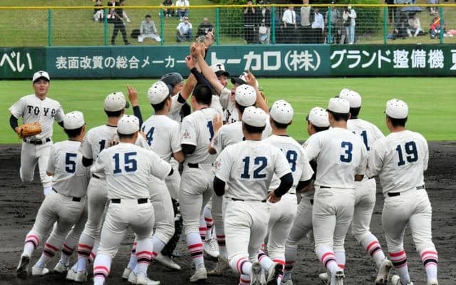 昨春の兵庫県大会で優勝を決めた東洋大姫路の選手ら=明石トーカロ