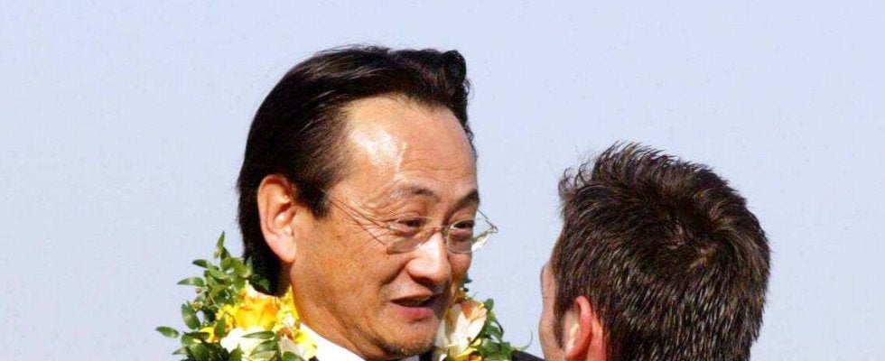 2004年にダイワメジャーで皐月賞を制し、Mデムーロ騎手と抱き合って喜ぶ上原博之調教師(左)