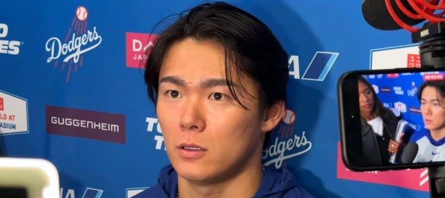 試合後、取材に応じるドジャース・山本由伸【写真:小谷真弥】