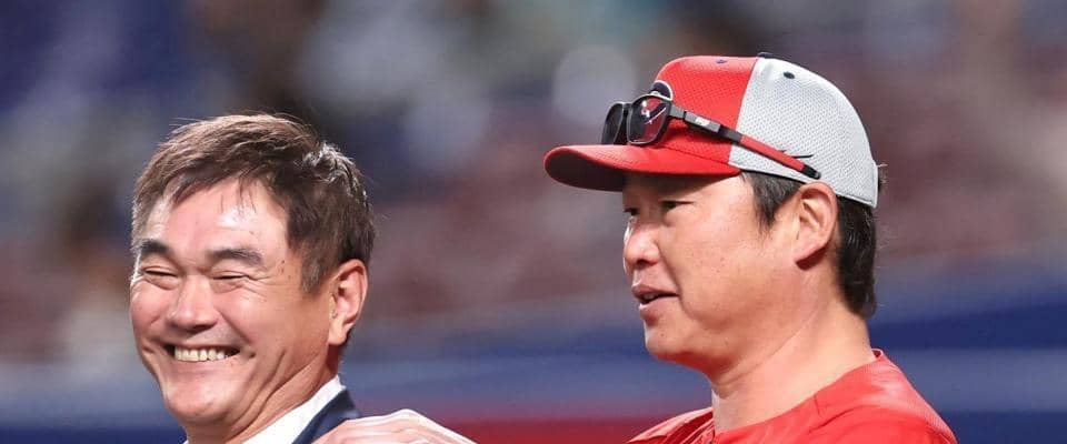 広島・新井監督が肩モミモミ→岩瀬氏がニコニコ 同期入団&同年引退の名球会レジェンドが仲良く交流 | 野球