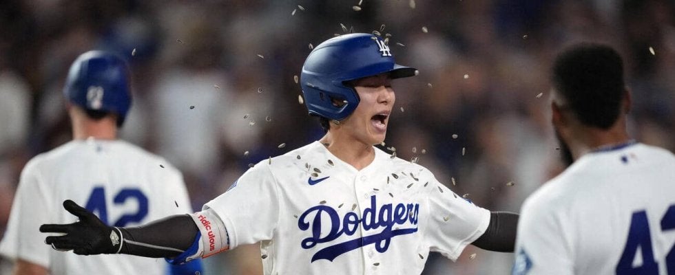 【写真】メッツ戦2回、先制2ランを放ったドジャースのキム・ヘソンはひまわりの種シャワーを浴びる(ロイター)