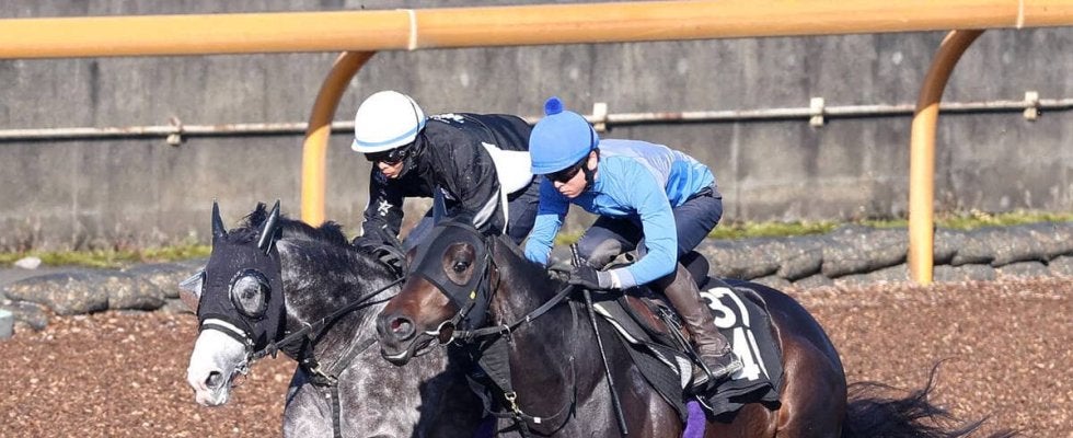 荻野琢真騎手を背にCWコースを併せ馬で追い切るアドマイヤテラ(左)