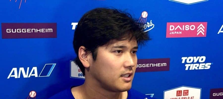 取材に応じるドジャース・大谷翔平【写真:小谷真弥】