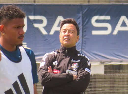 【写真】キニョーネス(左)ら選手の動きをチェックする横浜大島秀夫監督