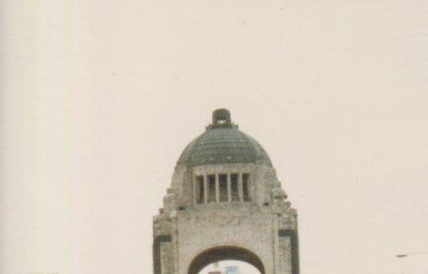 1986年メキシコ大会で革命記念塔前でのショット。後列右が筆者。その左は若き日のオランダ在住ライター中田徹氏。提供/後藤健生