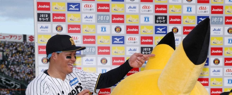 【写真】阪神対中日 ヒーローインタビューを終えピカチュウとじゃれ合う阪神森下(撮影・前田充)