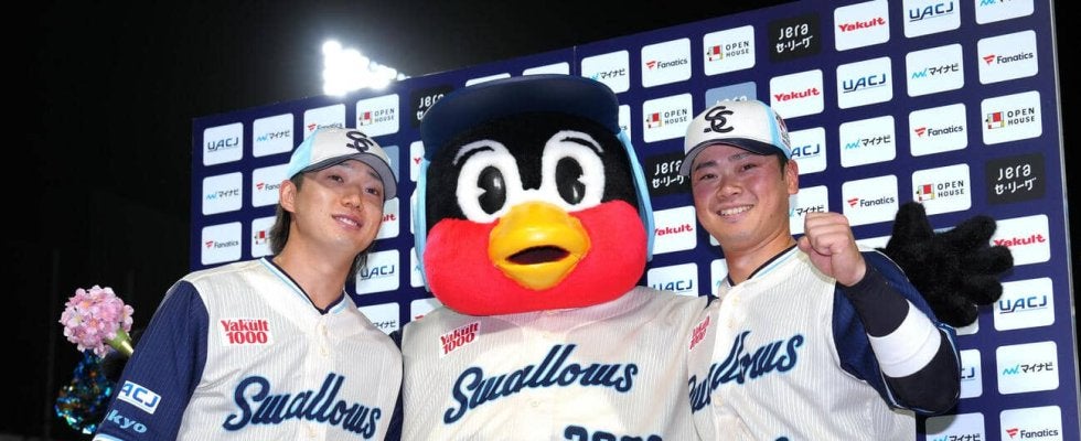 【ヤクルト】丸山和郁がつば九郎と笑顔で”小競り合い” 長岡秀樹に「もうちょっと…」愛のいじり | 野球