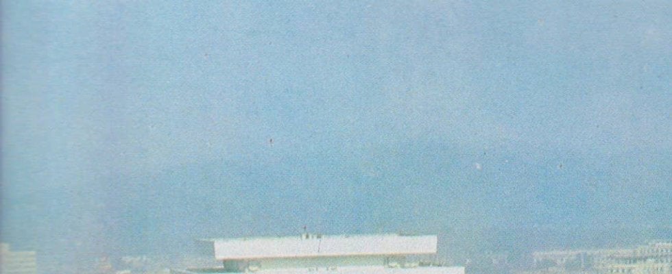 金日成スタジアムのスタンド越しに見たピョンヤンの凱旋門。提供/後藤健生