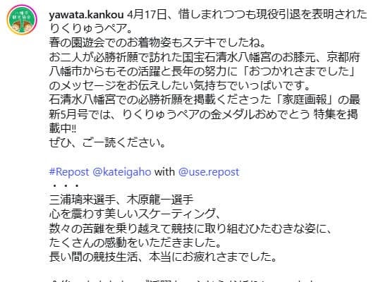 京都府八幡市の観光協会は19日までにインスタグラムを更新。フィギュアスケートのペア「りくりゅう」こと三浦璃来(24)木原…