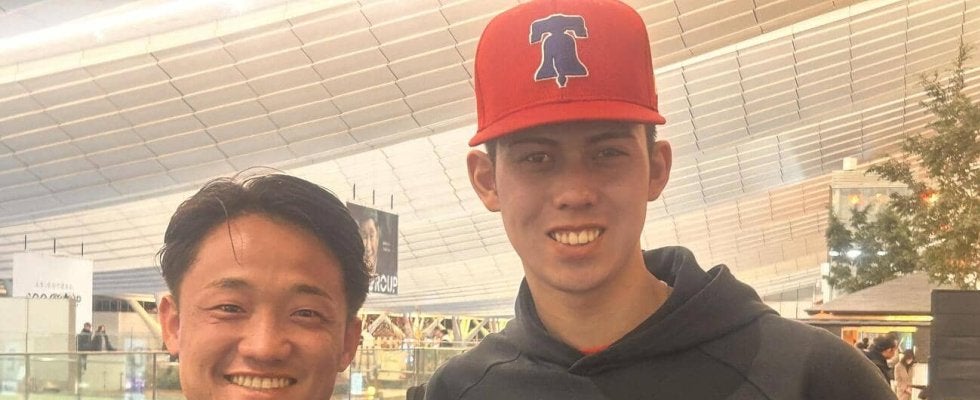 【写真】フィリーズとマイナー契約したモレチ・アレシャンドレ投手(右)と大塚虎之介スカウト