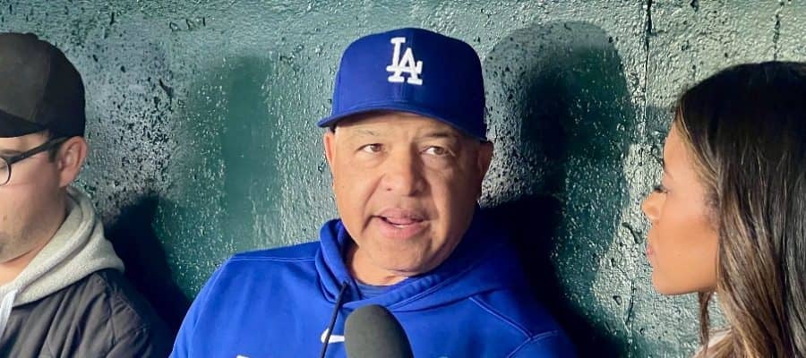 試合前、取材に応じるドジャースのデーブ・ロバーツ監督【写真:小谷真弥】