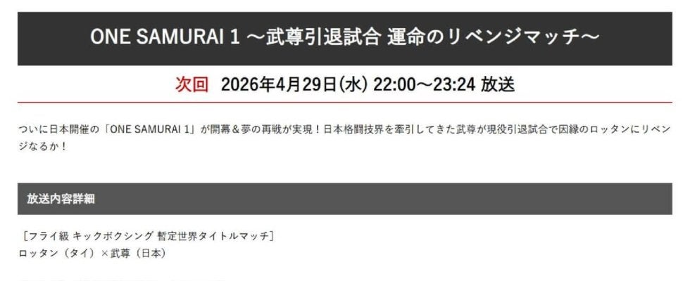 【写真】フジテレビは公式サイトで「ONE SAMURAI 1」の放送を発表した