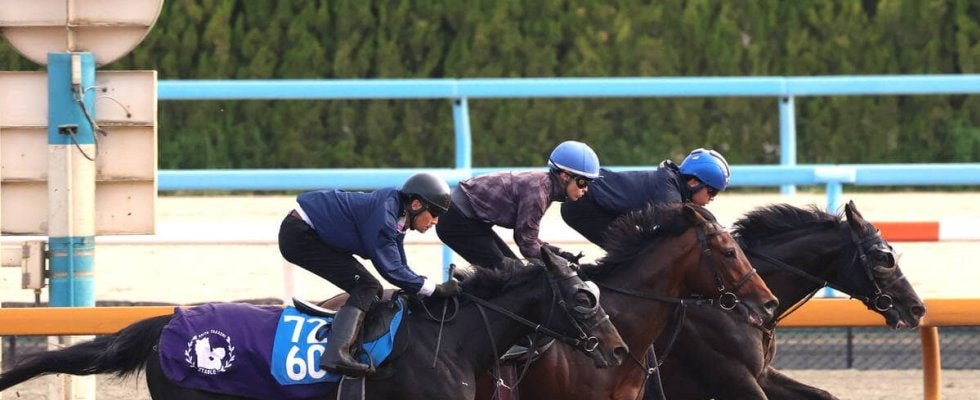 団野大成騎手を背にCウッドを3頭併せで追い切るクロワデュノール(右)