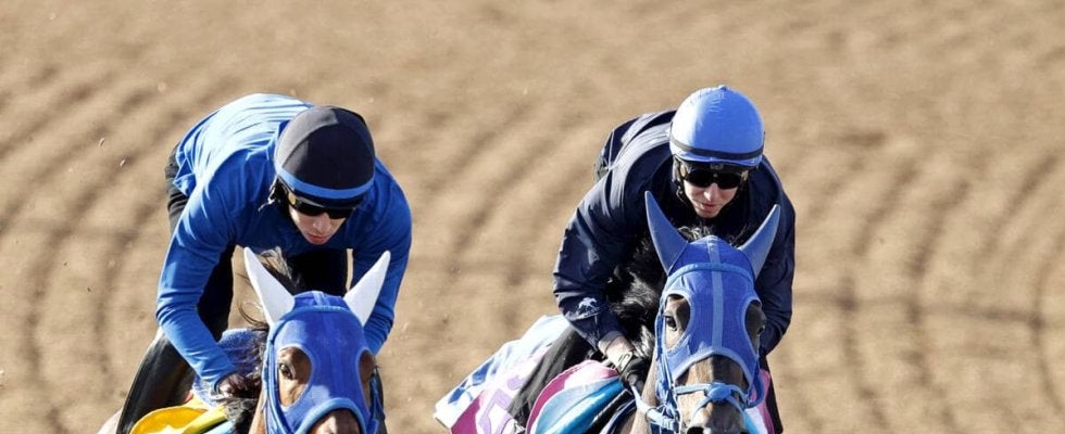 Wコースで追い切ったラフターラインズ(右、馬上はダミアン・レーン騎手)、左はエンセリオ(カメラ・荒牧 徹)