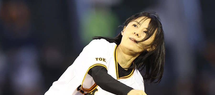 【画像】打者に向かって“大開脚” 女子アナに場内騒然…豪快始球式の様子