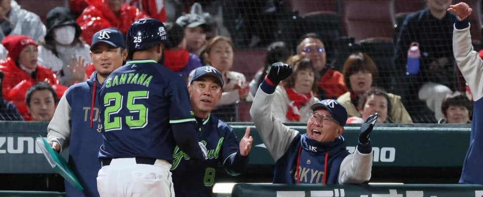 【写真】広島対ヤクルト 5回表ヤクルト2死一塁、先制右越え2点本塁打を放ったドミンゴ・サンタナを迎える池山隆寛監督撮影・加藤孝規)