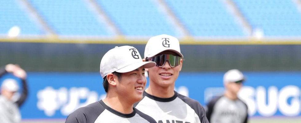 【写真】DeNA対巨人 アップ中笑顔で話す巨人石塚裕惺(左)と平山功太(撮影・増田悦実)