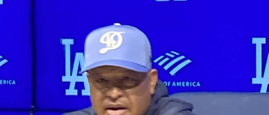 「ドジャース-カブス」(25日、ロサンゼルス) ドジャースのロバーツ監督が試合前の会見で今季初勝利を懸けて先発する佐々…