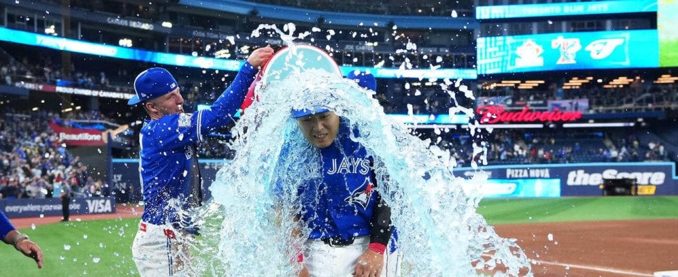 【写真】試合後、水をかけられるブルージェイズ岡本和真(ロイター)