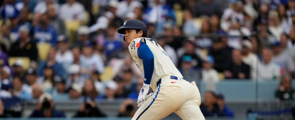 【写真】カブス戦の1回、左前打を放ち一塁を目指すドジャース大谷翔平(AP)