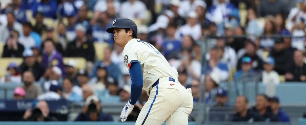 【写真】カブス戦の1回、左前打を放ち一塁を目指すドジャース大谷翔平(ロイター)