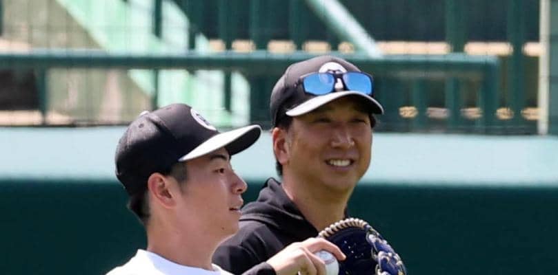 「阪神-広島」(26日、甲子園球場) 阪神の下村海翔投手が26日、甲子園の1軍試合前練習に参加。藤川球児監督も見つめる…