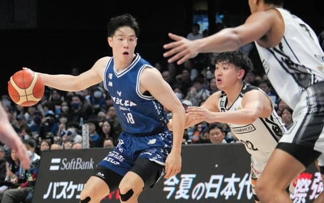 長崎ヴェルカの西地区初優勝に貢献した馬場雄大(左)。2023-24シーズンからチームのエースとして活躍してきた=2026年4月22日午後8時16分、ハピネスアリーナ、寿柳聡撮影