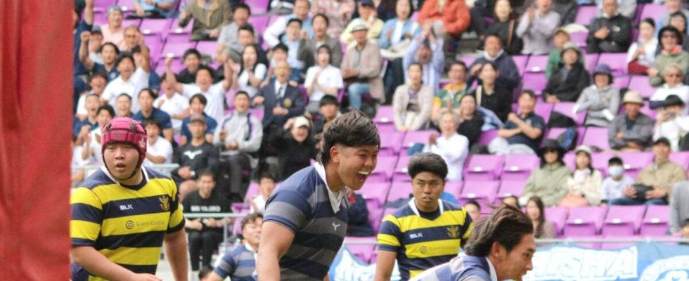 後半40分、途中出場の同大SH石黒春輝がトライ。直後のゴールキックが決まり同点、ノーサイドとなった