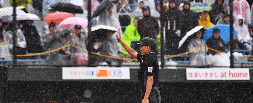 【写真】ソフトバンク対ロッテ 雨が強まり、ノーゲームが宣言される(撮影・岩下翔太)