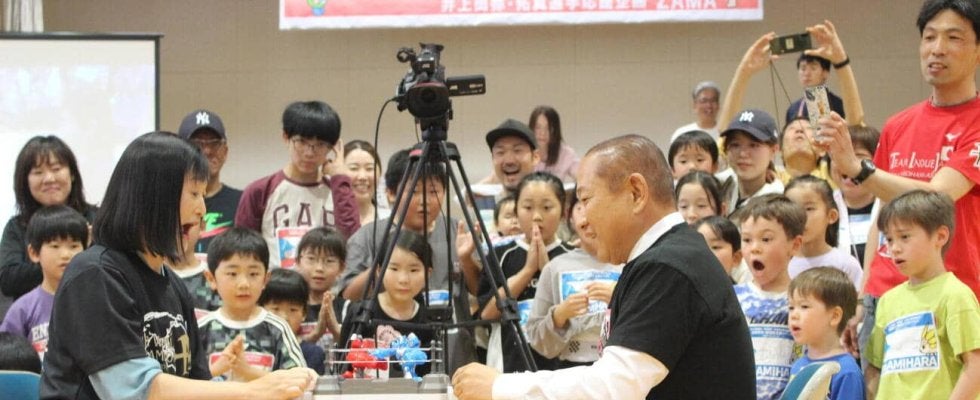 【写真】「市境チャレンジフェス」でロボットボクシングゲームで対決した井上尚弥の地元・座間市の佐藤弥斗市長(左)と、中谷潤人の地元・相模原市の本村賢太郎市長(2026/04/26、神奈川・相模原市の旧もえぎ台小学校体育館)