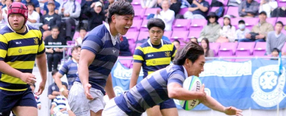 後半40分、途中出場の同大SH石黒春輝がトライ