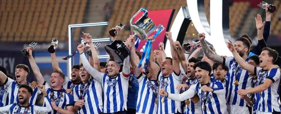 【写真】スペイン国王杯を制し、表彰台で喜び合うレアル・ソシエダードの久保建英(右から5人目、AP)