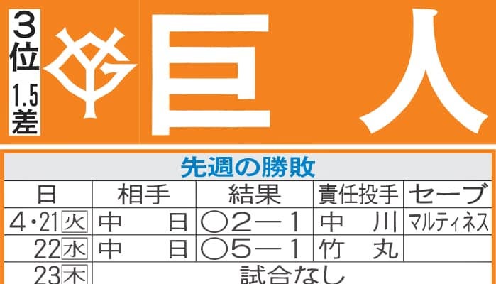 【写真】巨人先週の勝敗と今週の予定