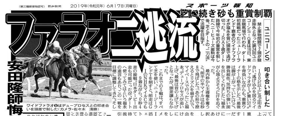 ワイドファラオが勝った2019年のユニコーンSを報じるスポーツ報知の記事